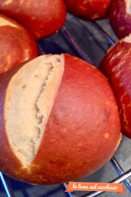 In una pentola alta portiere a bollore l’acqua con bicarbonato e sale aggiunti a freddo.Tuffare qualche panino per volta, attendete 30 secondi e scolare con una schiumarola.Disporre i panini su una placca da forno precedentemente coperta da carta forno formando due corone ben serrate e aspettare che la superficie esterna si asciughi.Con una lametta praticare un taglio verticale su ogni paninoCuocete in forno già caldo a 180°C per circa 20-25 minuti. O fino a che i panini non abbiano riaggiunto il tipico colore brunito.