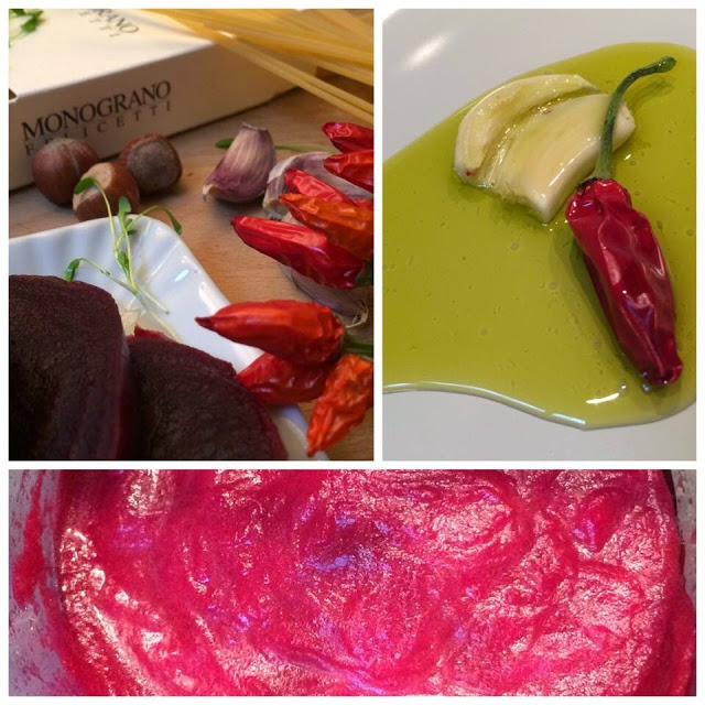 Allo stesso tempo preparare un aglio olio e peperoncino in una padella a fuoco medio lasciando insaporire per qualche minuto, unire gli spaghetti scolati bel al dente aggiungere un cucchiaio abbondante a testa di barbabietola e insaporire per un paio di minuti unendo poca acqua di cottura della pasta.